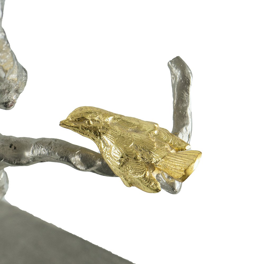 Infusing the tranquil beauty of nature with a modern touch, the wandering silver branches of each sculpture are topped with two little golden birds.