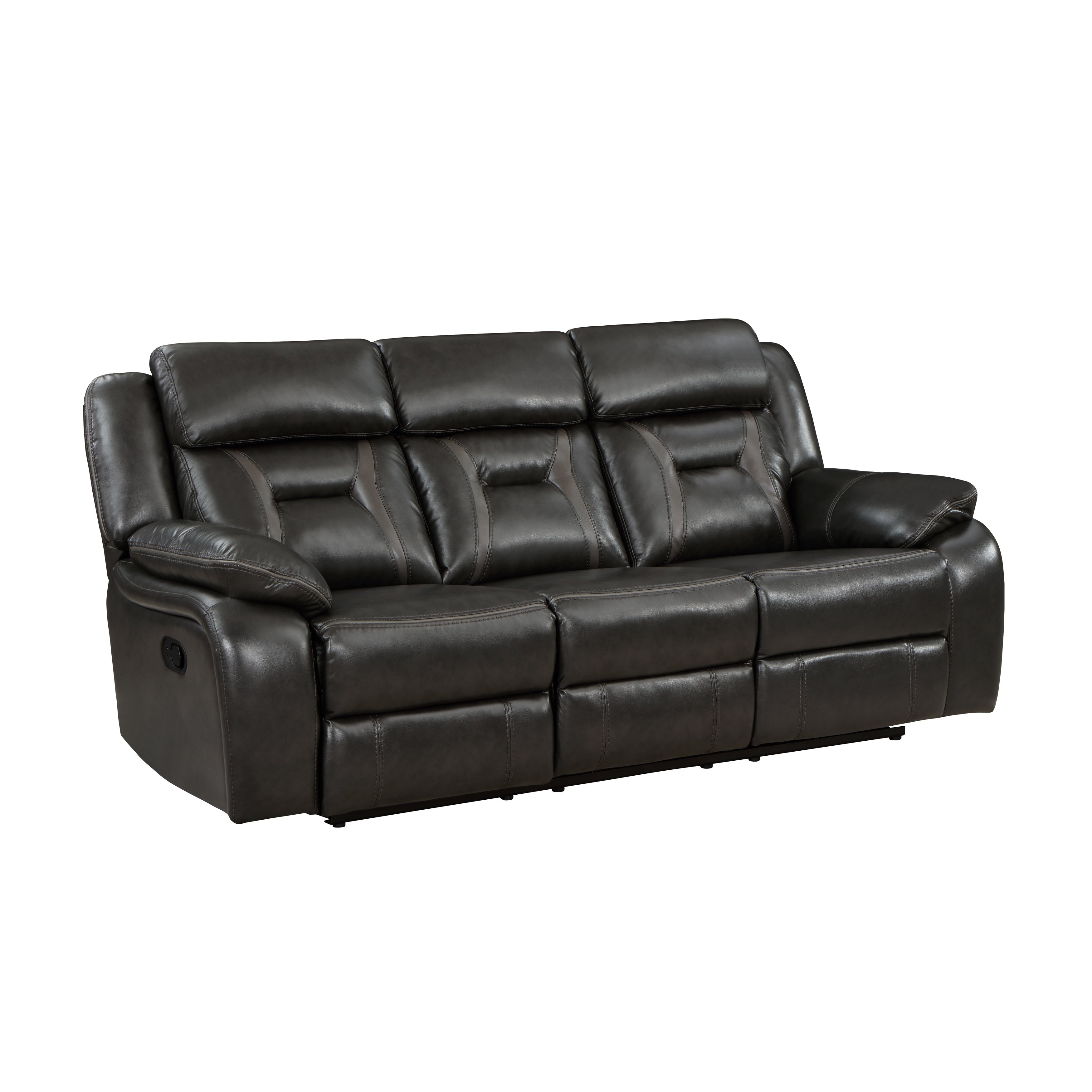 Ultra-modern design combined with convenient function makes the Amite Collection a stylish addition to your contemporary home. Dark gray premium faux leather upholstery is perfectly complemented by light gray accenting on the seatbacks, seats, and arms of the sofa providing contrast and definition to the profile of the collection. With the pull of the manual reclining mechanism tab, the recliners ease to the prone position.PRODUCT DIMENSIONS: Overall Dimension: 86" x 39" x 41"HSeat Width: 63"Seat Depth: 21"Seat Height: 20"Arm height: 26"Fully reclined length: 65"Fully reclined height: 32"Doorway width: 26"Required back clearance to recline: 5"Listing Includes: One Sofa (Dual Reclining) Only.Chair & Loveseat: Not included.Simple Assembly Require