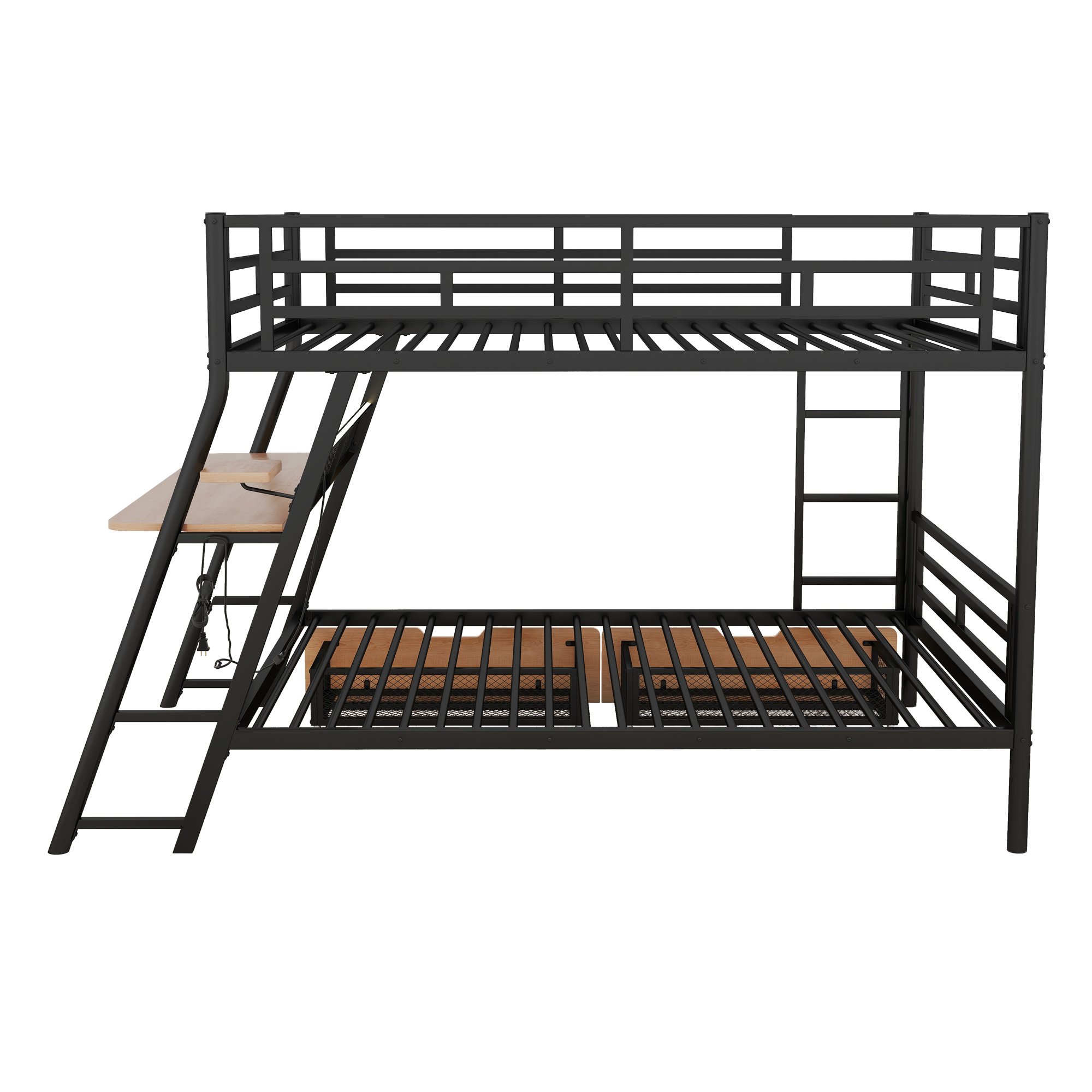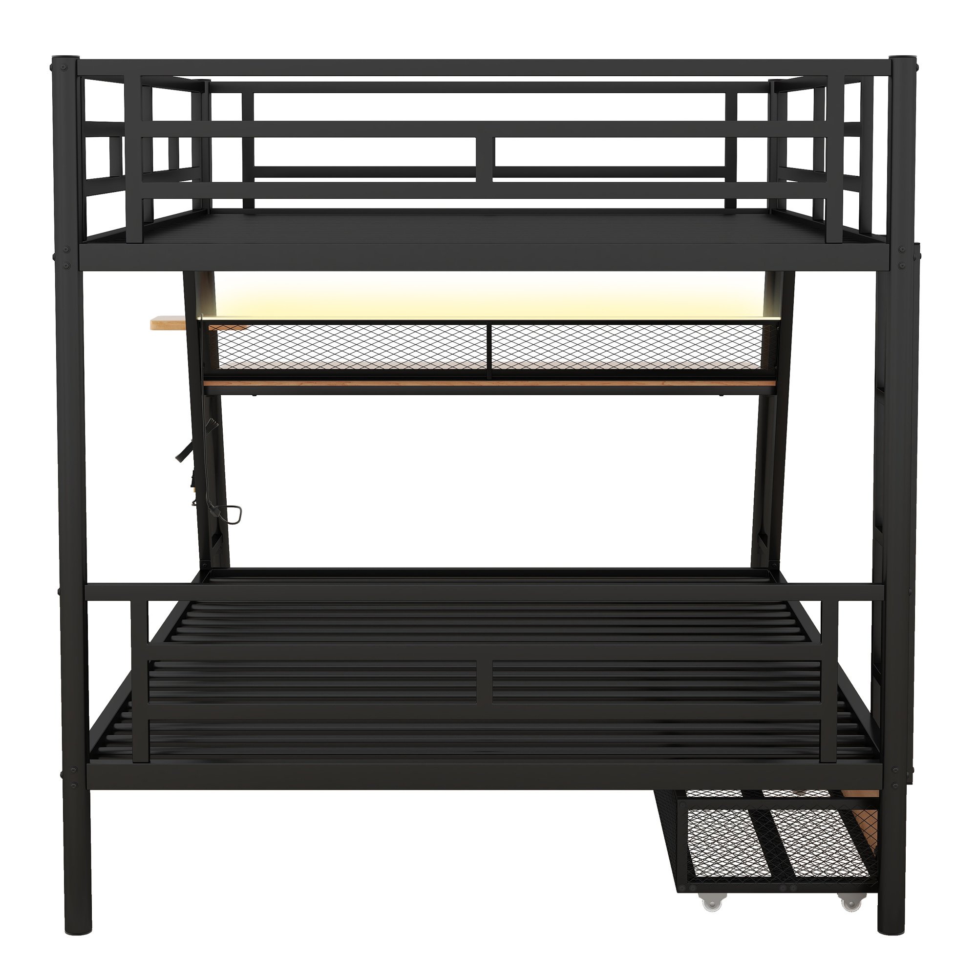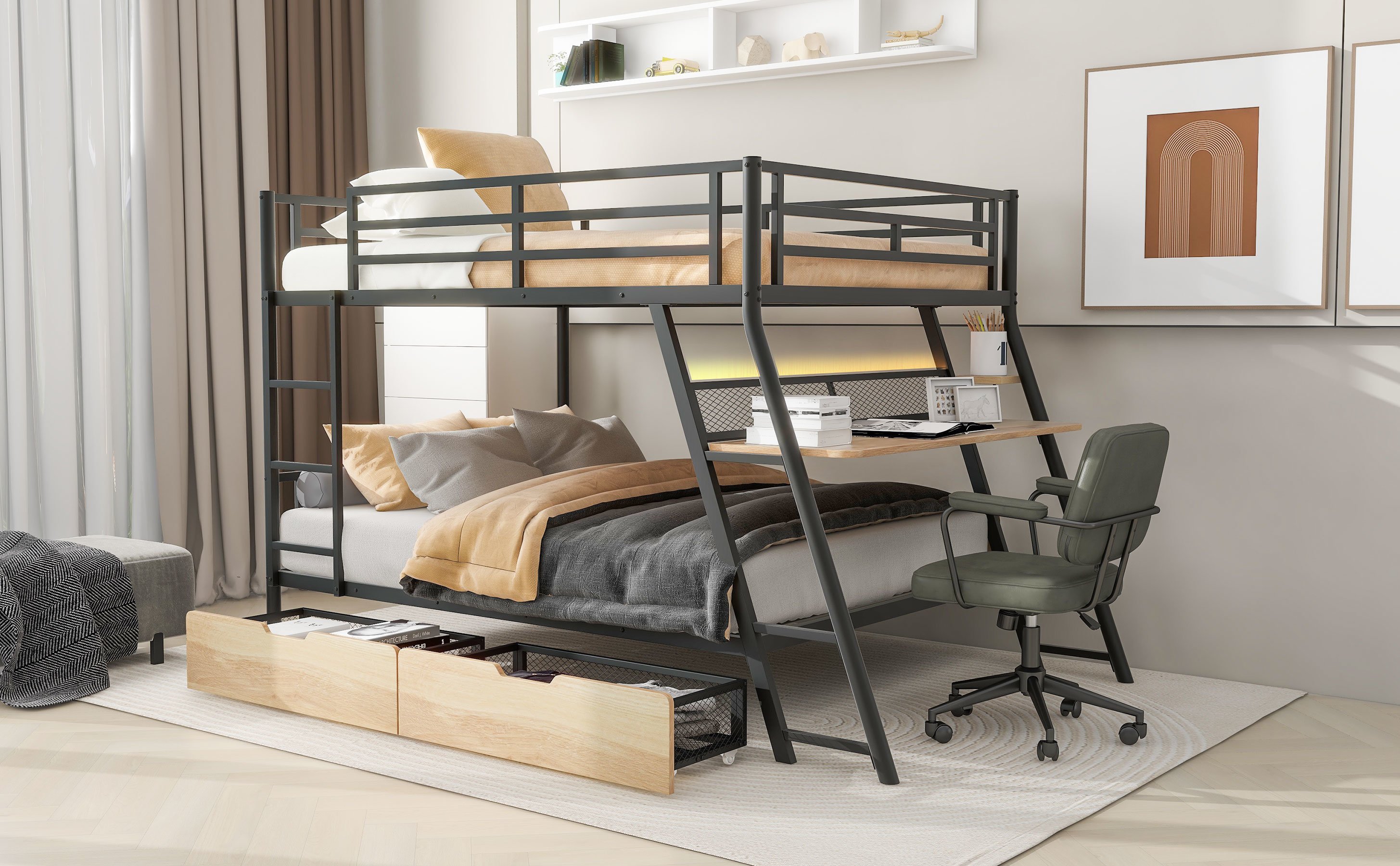 Full Size Metal Bunk Bed with Built-in Desk, Light and 2 Drawers, Black