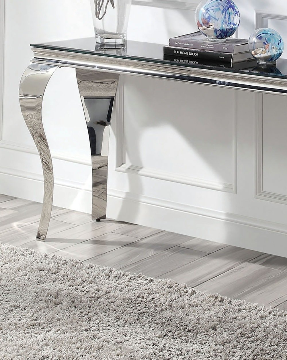 Product Description:-Now, if there is a piece worth its weight, this is it! Each table in this glamorous set is crafted from stainless steel. Hefty in weight and looks, it features beautiful curved, cabriole-style legs that as expressive as they are timeless. The tops are made of beveled tempered glass showing either black or white shade to match your neutral, modern space.Product Dimensions:-SOFA TABLE:- 55"L X 16"W X 30"HListing Includes :- 1x Sofa Table Only.Simple Assembly Requires:Features:-GlamBlack/SilverMetal, GlassStainless Steel ConstructionBeveled Tempered Glass TopCabriole-style Legs