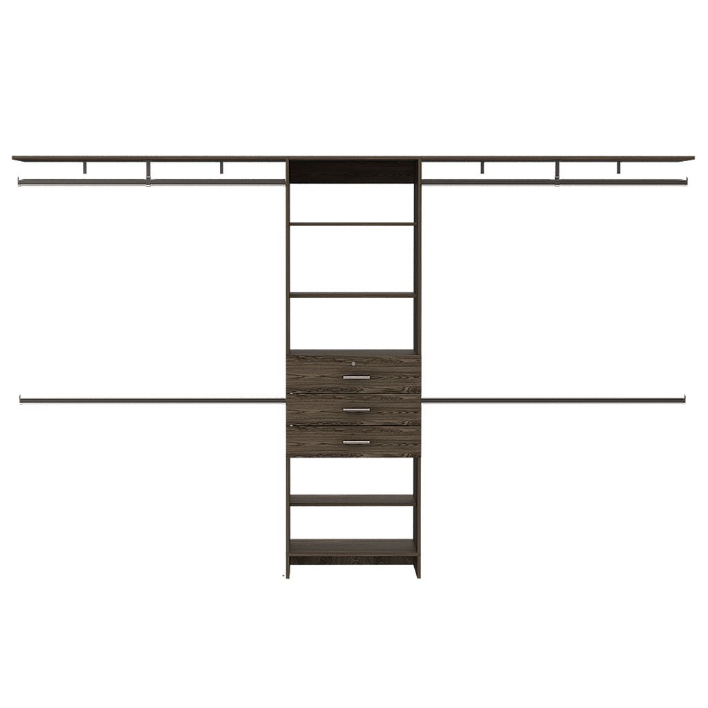 Plego 69"W - 118"W Drawers Closet System, Five Shelves, Four Hanging Rods, Three Drawers -Dark Walnut