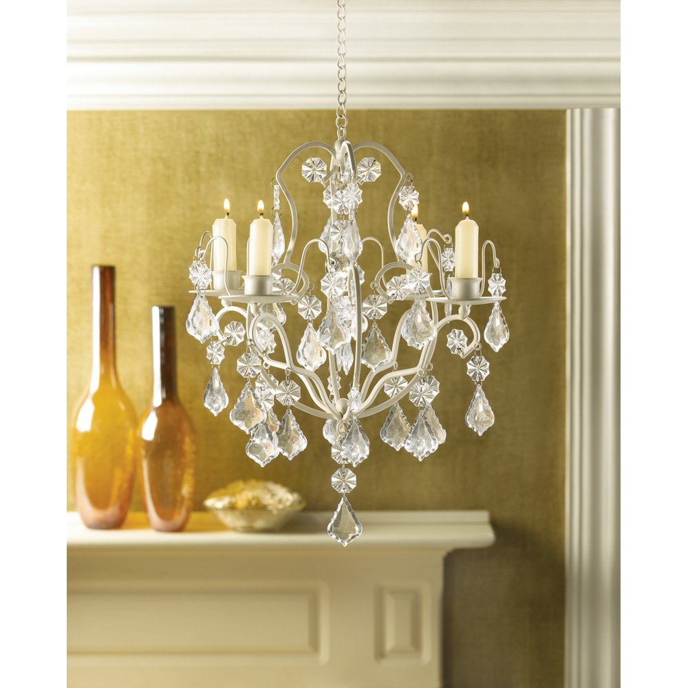 • This lighting decor weighs 1.8 lbs. and measures 11 inches by 11 inches by 15 inches. Holds four taper candles and hanging chain is included.