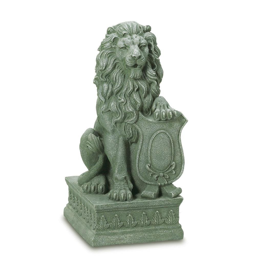 • With his mighty paw placed atop a crested shield, a regal lion surveys all who approach the door to your “castle.” Inspired by the centuries-old stone carvings found in castles and cathedrals throughout Europe, this impressive statue makes a bold historical statement and lends distinction to your entryway or garden!