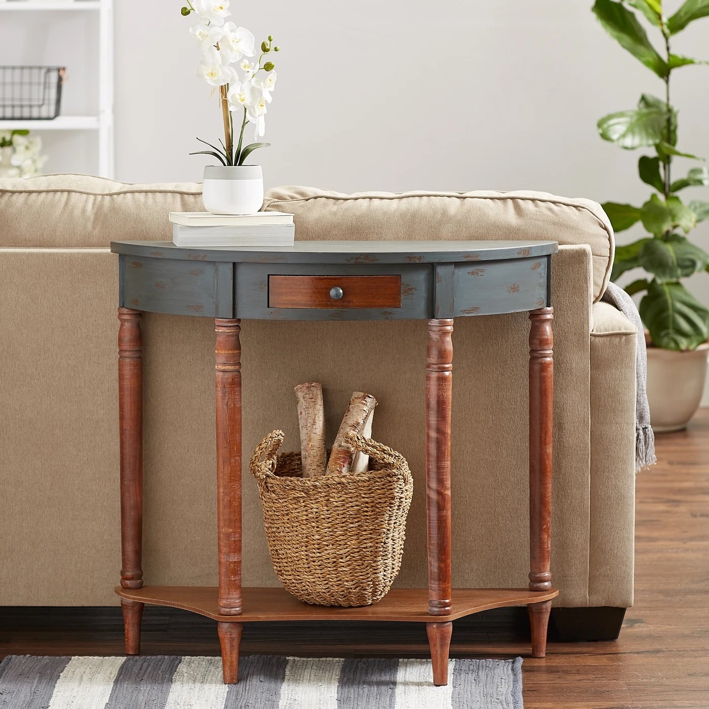 • This beautiful hall table looks like a timeworn family treasure passed down through generations. The half-moon shape is perfect for your entry way or hall to add style and a little bit of storage. It features a pullout drawer and display shelf below.