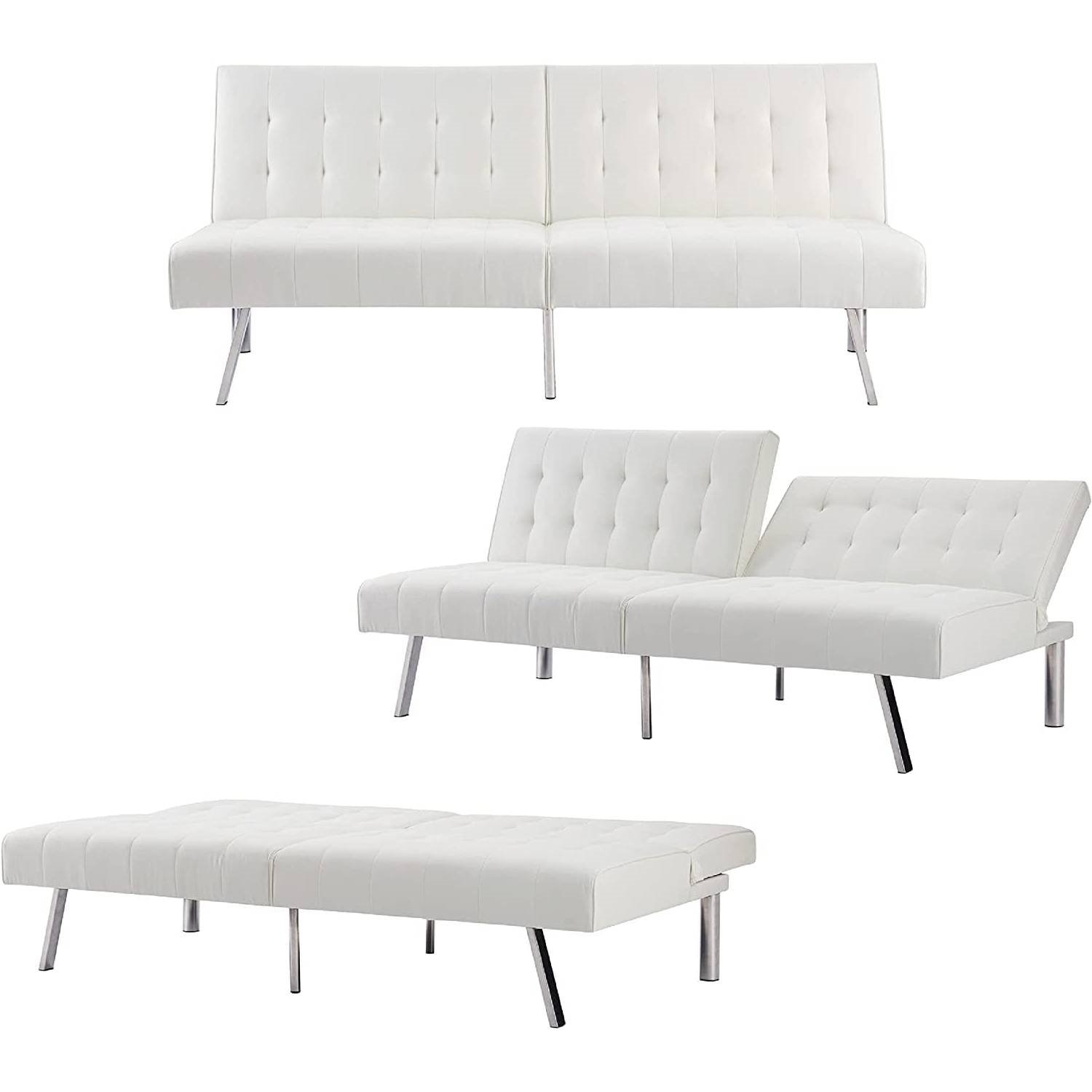 • VERSATILITY: Perfect for small spaces, this futon convertible sofa cama para sala is well suited for any apartment or studio. The Split Back design also provides the added comfort of adjusting different incline angles for either side of the White Futon Sofa. A robust frame, thick padded support with PU faux leather and stable legs made of Chrome make this Convertible Sofa Bed your ideal choice.