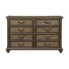 The balance of rusticated accenting and elegant form is exquisitely achieved in the design of the Rachelle Collection. The traditionally styled dresser features classic appointments such as turned feet brown-finished metal drop hardware, egg and dart molding and rounded pilasters. The knotty pecan wood veneer features a weathered pecan finish further lending to the classic look of the collection.PRODUCT DIMENSIONS: Overall Dimension: 64" x 18" x 42"HDrawer interior: 24.75" x 14" x 5.75" (8)Listing Includes: One Dresser Only.Mirror: Not Included