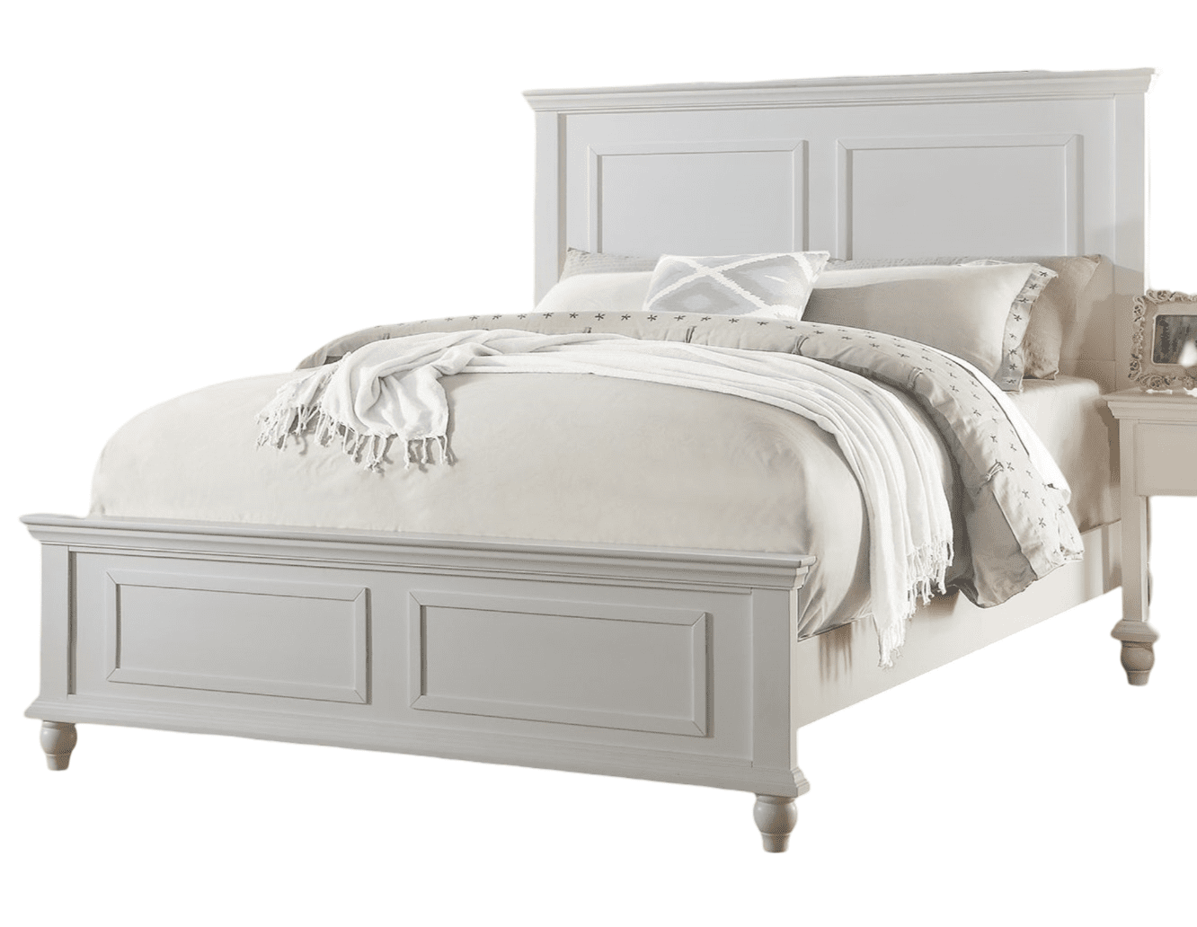 Transform your sleeping space into a haven of style and comfort with this all-in-one solution that marries functionality with cutting-edge design. Enchant your senses with this boldly designed bedroom set inspired by country living. It features a bedframe with rectangular sketched designs and elaborate accent lines for a multi-dimensional look. Available in White. Bedframe available in Queen, California king or Eastern king.